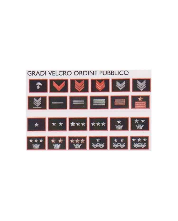 | Gradi Carabinieri | Carabiniere, Carabiniere scelto, Appuntato, Appuntato scelto, Vice Brigadiere, Brigadiere, Brigadiere capo, Maresciallo, Maresciallo Ordinario, Maresciallo Aiutante, Maresciallo Luogotenente, Sottotenente, Tenente, Tenente Comandante, Capitano, Maggiore, Tenente Collonn., Tenente Colonn. Comandante, Colonnello, Col. Comandante, Maresciallo Capo, Appuntato scelto Q.S, Brigadiere capo Q.S., Maresciallo Luogotenente Q.S. |