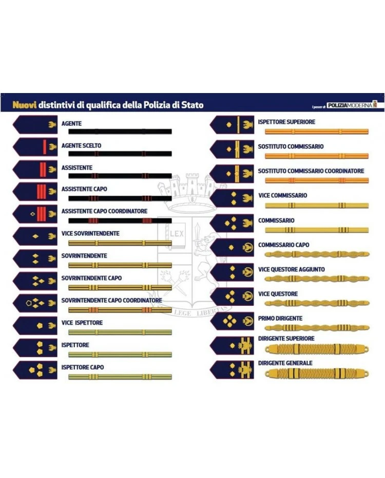 | Gradi Polizia | Agente scelto, Assistente, Assistente Capo, Vice Sovrintendente, Sovraintendente, Sovrintendente capo, Vice Ispettore, Ispettore, Ispettore capo, Ispettore Superiore, Sostituto Commissario, Vice Commissario, Commissario, Commissario capo, Vice Questore Aggiunto, Primo Dirigente, Assistente capo coordinatore, Sovrintendente capo coordinatore, Sostituto commissario coordinatore, Vice Questore |