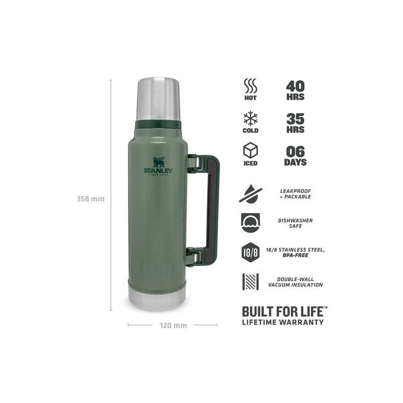 In campeggio, in cantiere ,in camper: lo stile iconico e la robustezza di questo contenitore termico significano che è fatto per andare ovunque. L’isolamento sottovuoto a doppia parete mantiene tutte le tue bevande alla temperatura ideale e il tappo girevole consente un versamento più fluido. Il manico pieghevole è realizzato per essere afferrato facilmente e il coperchio isolato funge anche da tazza per bere.
